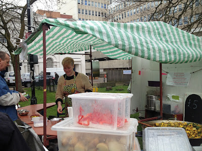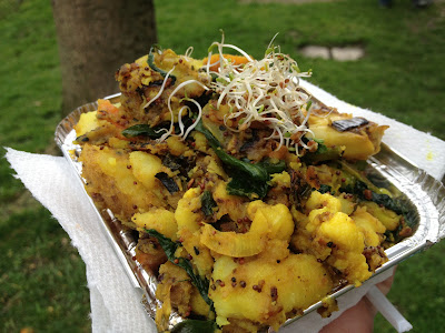 My final destination was Big Pan Cooking where I was pleased to see another sign advertising meat free meals. Big Pan Cooking make one huge pan of vegan stir fry with either potatoes or a grain as the base and a tonne of fresh veggies. This is piled high and topped with spicy chilli beans, or in my case, no beans. I'v never been able to handle spice and I've recently developed a full on chilli allergy! Fun!